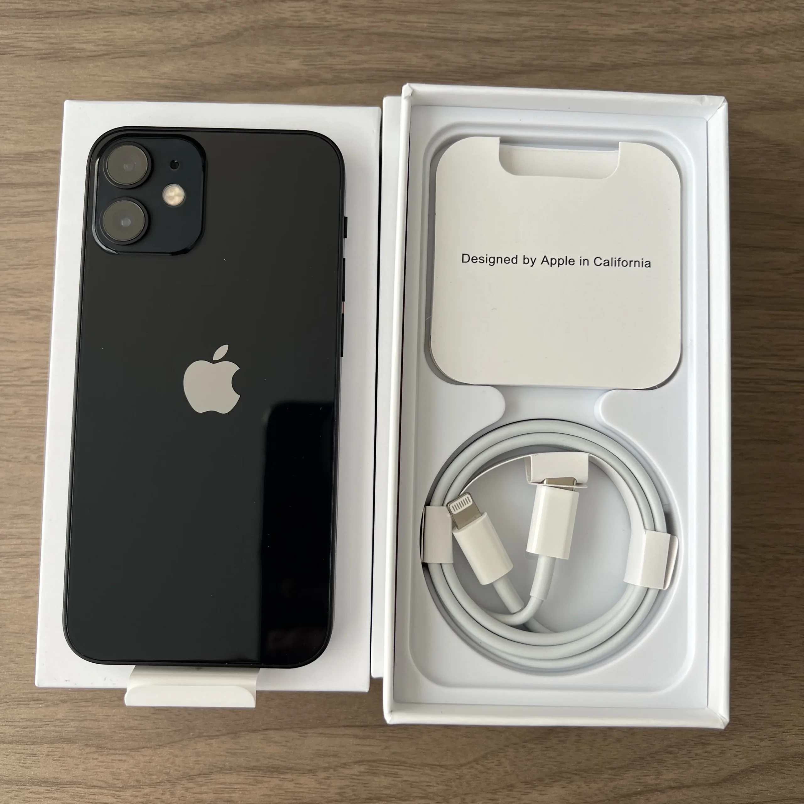 L’iPhone12 mini ne comprend pas d’adaptateur secteur ni d’écouteurs.Dans la boîte se trouve un câble USB‐C vers Lightning qui prend en charge une charge rapide et est compatible avec les adaptateurs secteur USB‐C et les ports d’ordinateur.